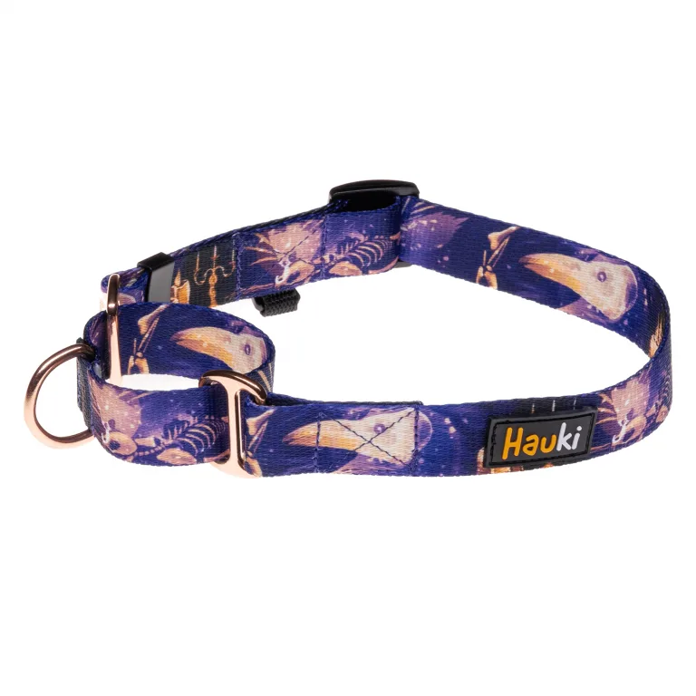 Bliska kuzynka obroży półzaciskowej, stanowi bardzo dobrą alternatywę dla osób ceniących sobie łatwość zakładania oraz ciszę. Dzięki zastosowaniu dodatkowej taśmy pełniącej funkcję amortyzatora, obroża martingale minimalizuje dźwięki stukania, oferując jednocześnie możliwość szybkiego zakładania oraz ściągania.